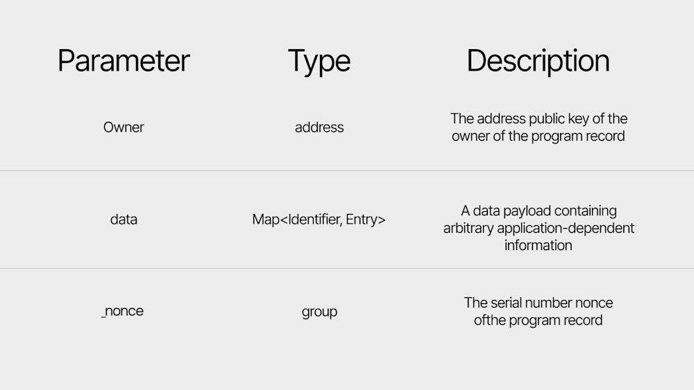 In the record model, the application state, along with its owner are encrypted and stored on the blockchain. Records are a fundamental data structure that can contain any arbitrary payload and are used for encoding user assets or application states. Records represent a fragment of the global state kept on chain. For example, the balance of your credits in a given account is composed by the multiple credit records that have your address as the owner.