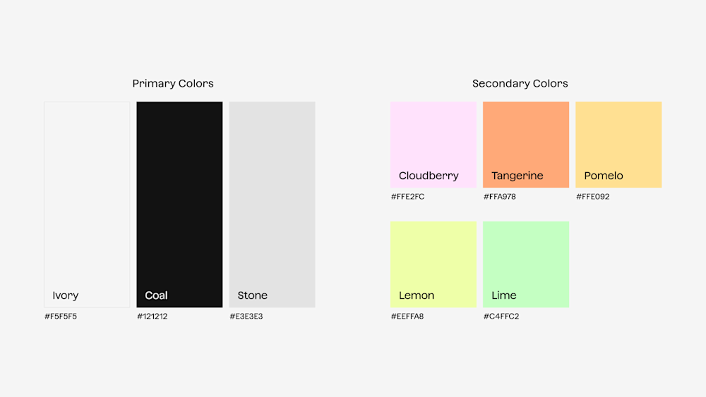 Our color palette has also been greatly simplified, focusing on ivory, coal, and stone, as well as an expanded secondary color palette to help us represent the myriad of use cases possible within the ecosystem.