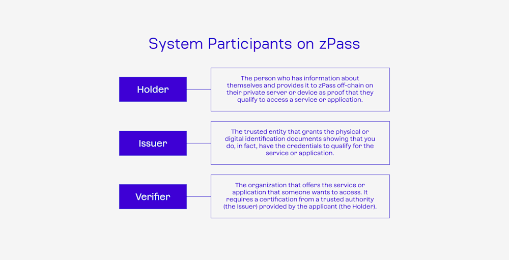 Like in the physical world, three major participants work together on zPass to provide proof and validate a user ’s information online: the Holder, the Issuer, and the Verifier.