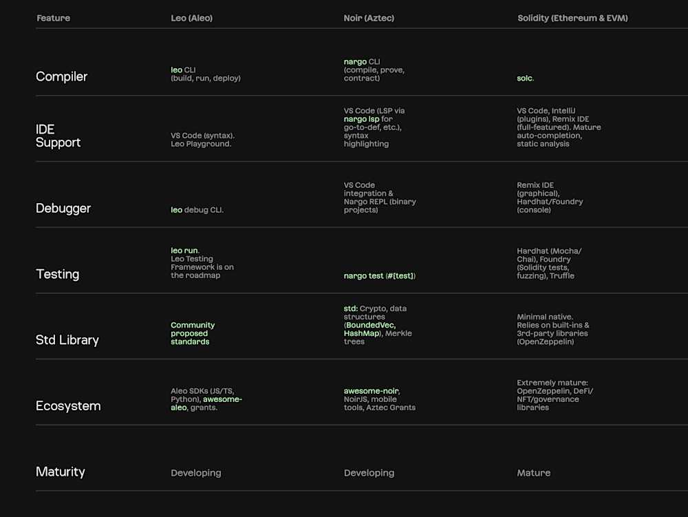 In summary, the choice of language significantly affects the onboarding experience for ZK and smart contract development. Leo lowers the barrier to entry into ZK, Noir offers powerful but complex abstractions, and Solidity provides a well-supported environment with more familiar syntax for many developers.