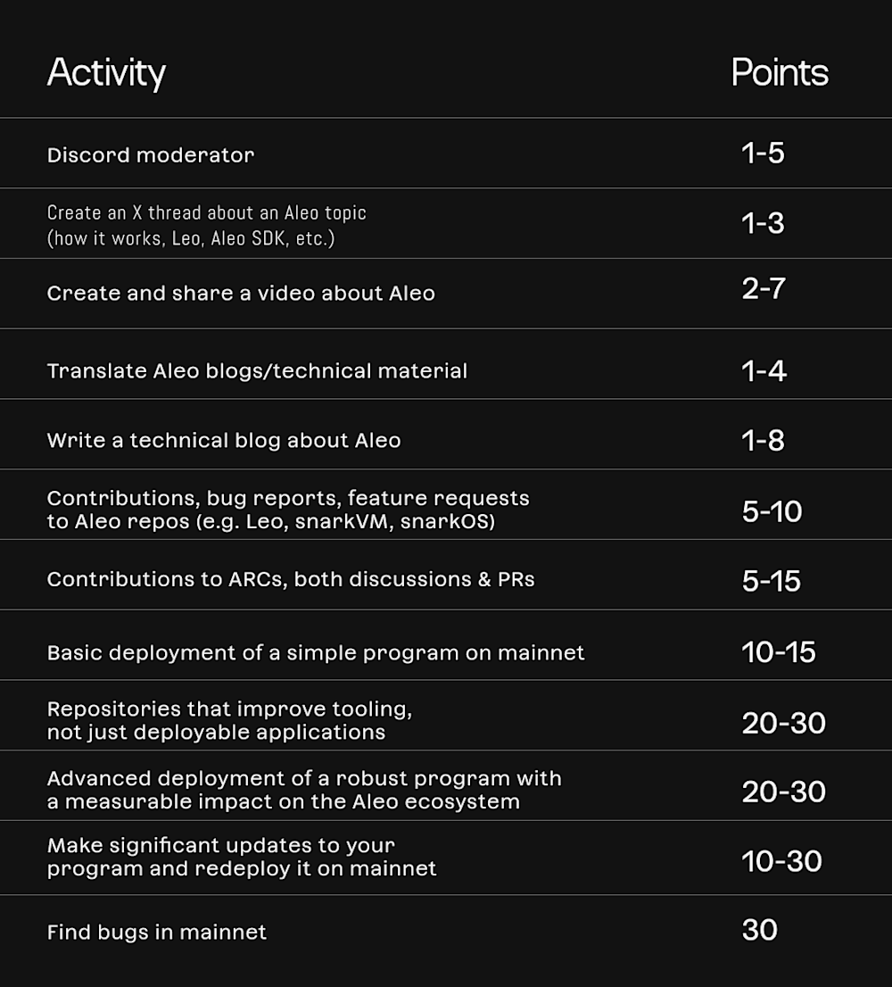 As all ambassadors are well aware, Aleo points hold no inherent value. The points are a means of participating in the ambassador program and keeping note of top contributors. Since Aleo points hold no inherent value, we wanted to think of other ways to engage our community alongside the official launch of mainnet and to thank them for being a part of this project throughout the years.