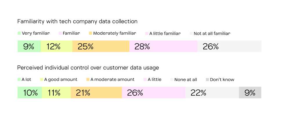 In general, the public is frustrated about their lack of knowledge or control over their data. Just over a fifth of respondents said they were familiar with how companies use their data or that they felt like they had a good amount of control over how companies use their data.