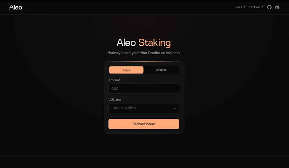 Native staking enables token holders to interact onchain and stake their Aleo Credits directly, without the need to rely on third-party programs or custodial services. As mentioned, native staking is part of the consensus process and is defined in the core network protocol. As such, the native staking functions are made available through the credits.aleo program. In order to participate in native staking as a delegator, users must be able to stake at least 10,000 Aleo Credits. We've provided an interface to help users get started at staking.aleo.org.