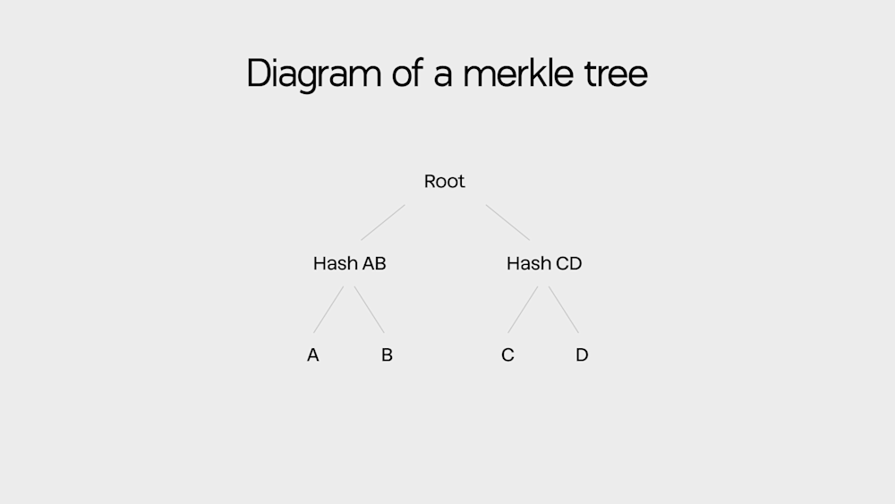 Here's how it works: imagine you have four documents—A, B, C, and D. Each document gets its own unique hash. Then you combine hashes A+B to create a new hash, and C+D to create another. Finally, you combine those two to create the root at the top.