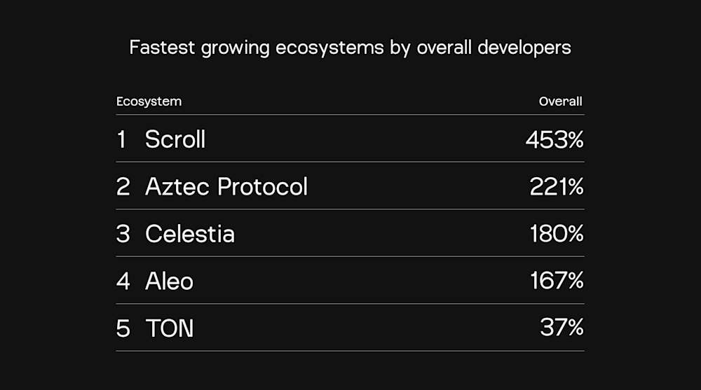 Aleo is in good company. The top five ecosystems listed in the report include Scroll, with the largest growth (453%), followed by Aztec Protocol (221%), Celestia (180%), Aleo (167%), and TON (37%).