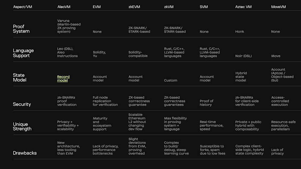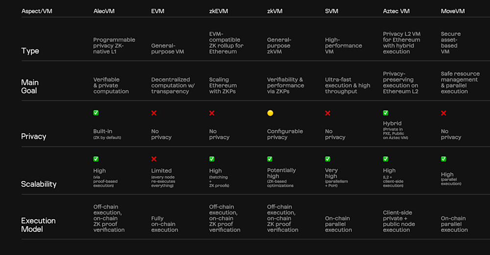 We'll examine how AleoVM/snarkOS compares to virtual machines including EVM, zkEVM, zkVM, Solana's SVM, Aztec VM, and MoveVM, analyzing their unique approaches to computation, privacy, and scalability.